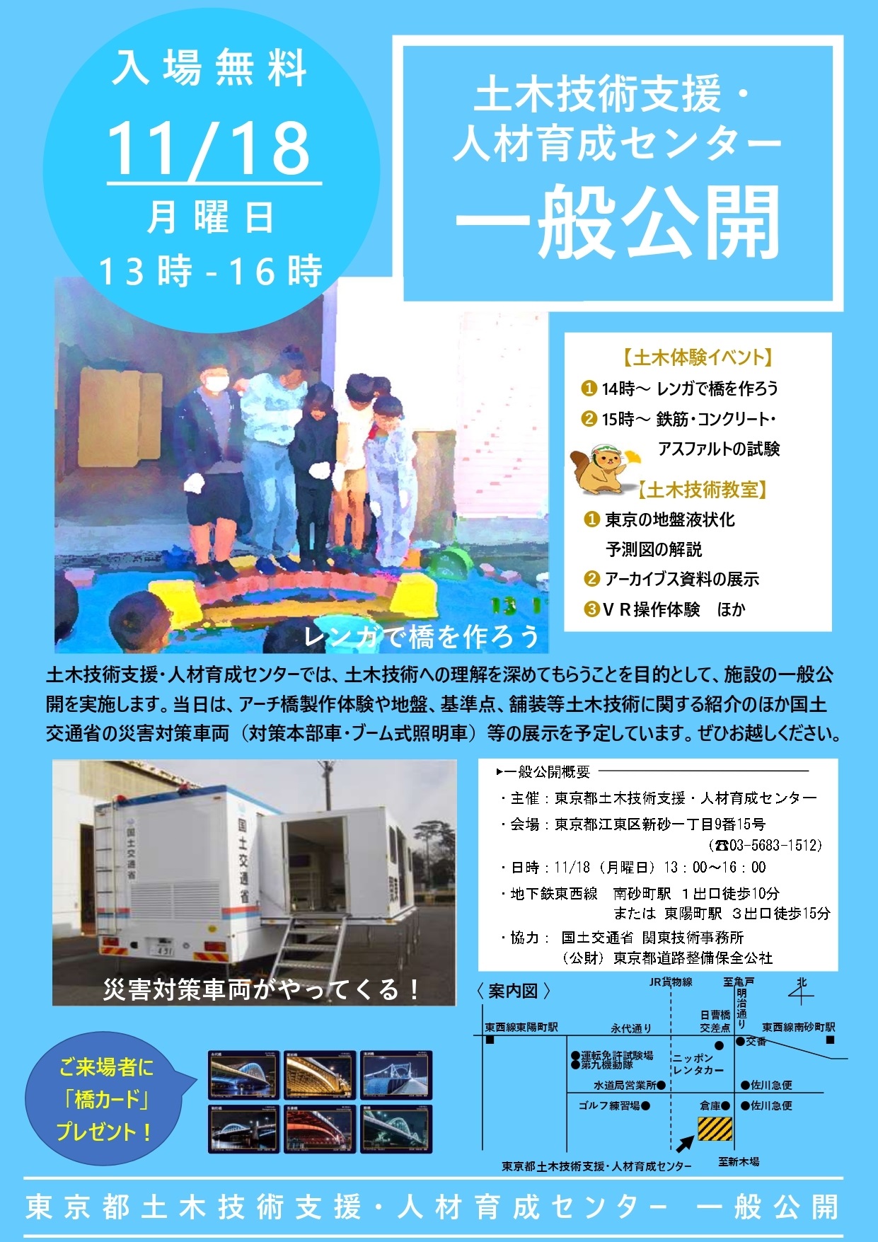 土木技術支援・人材育成センターでは、「土木の日」にちなみ、土木技術への理解を深めてもらう事を目的として、令和6年11月18日(月)に施設の一般公開を実施します。アーチ橋製作体験や地盤、地下水、基準点、舗装等土木技術に関する紹介のほか、国土交通省の災害対策車両(対策本部車、ブーム式照明車)等の展示を予定しています。