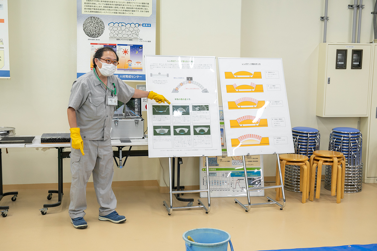 アスファルト混合物がどのように作られているのか等についての説明の後、砂や砂利等の材料に触れていただきました。アスファルト混合物は常温だと固いものの、高温になるとアスファルトが溶け柔らかくなります。60℃に温めたアスファルト混合物を曲げる体験を行い、子どもの力でも容易に曲げて割ることができることを実感していただきました。