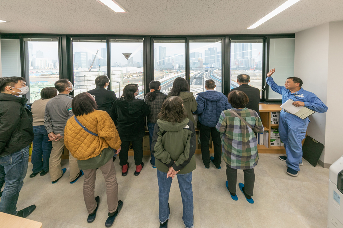 さらに、窓からは今後再開発が予定されている築地市場跡地を望むことができます。参加者の皆様は窓から見える眺望を写真に収めていました。
