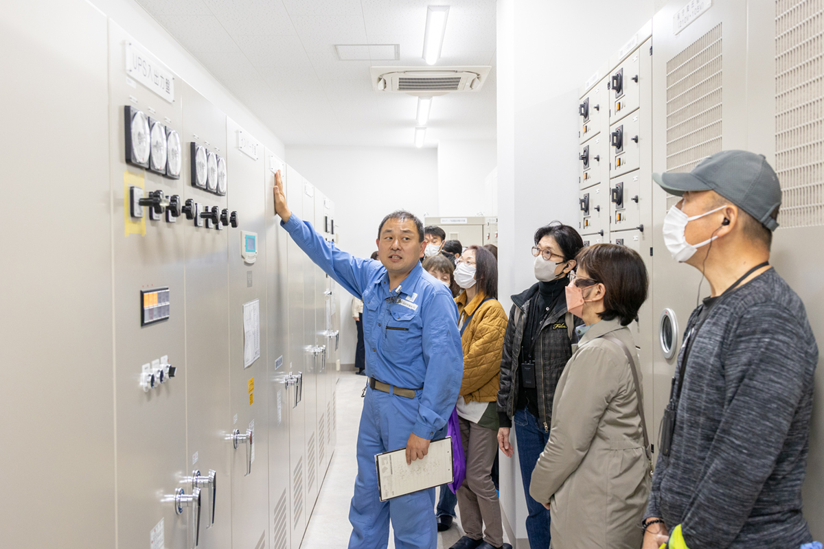 電気室の受変電設備では、6,600Vで受電した電圧をトンネル施設の各機器に必要な電圧へ降圧して供給しています。多くの設備がずらりと並ぶ様子に、参加者の皆様は興味津々の様子でした。