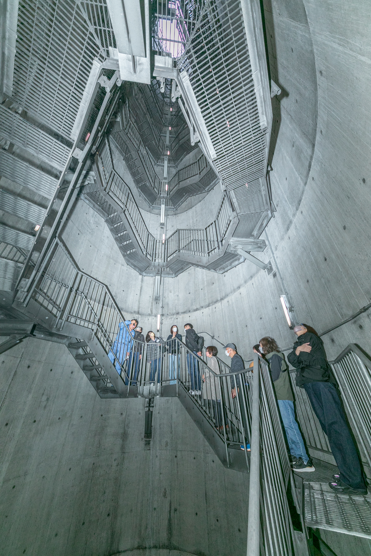 築地虎ノ門トンネルの換気塔は、高さ45m(地上部)にも及びます。換気塔では、トンネル内の空気を、換気所の設備によりきれいにした上で排出しています。普段は入ることのできない換気塔内部の階段を上りながら見学していただきました。参加者の皆様は、実際に内部に入ることでその高さを実感されたようで、感嘆の声をあげられておりました。