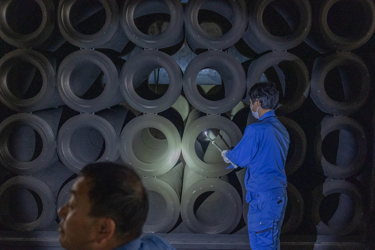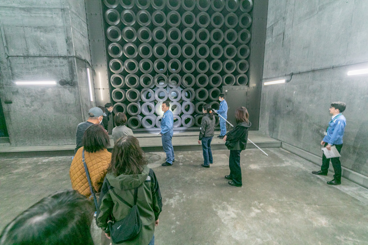 消音装置は、換気塔から空気を排出する際の騒音を低減させるための円筒形の装置で、筒の中には吸音材としてグラスウールが充填され、壁一面に積み上げられています。筒の内外を空気が通り抜けることにより、グラスウールに騒音が吸収されるという仕組みとなっています。どのくらい騒音が吸収されているのかを体感していただくため、防犯ブザーを消音装置内に置いて実験しました。実際に音が吸収されている様子に、皆様大変驚かれていました。