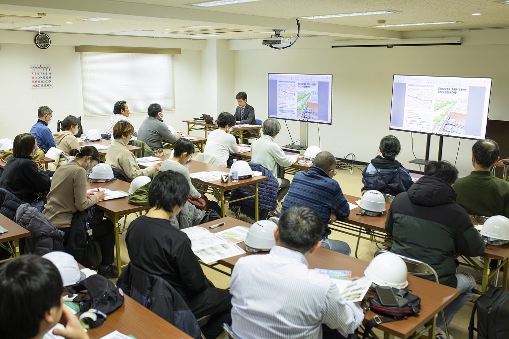 工事内容を分かりやすく図解した資料や、工事の進捗がまとめられたビデオを視聴した後、安全のためのヘルメット、軍手を装着し工事現場へ出発しました。